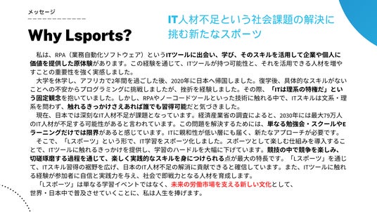 また、今後は地方自治体や学校との連携を強化し、地域ごとの特色を活かしたLスポーツイベントの展開も進めていきます。本協会は、ITスキルを楽しく学びながら、より多くの人々がデジタル社会で活躍できる場を創り出します。