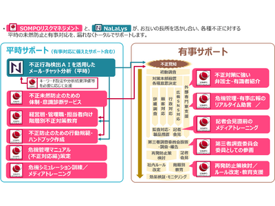 SOMPOリスクマネジメント株式会社(本社:東京都新宿区、代表取締役社長:中嶋 陽二、以下「SOMPOリスク」)と株式会社NaLaLys(本社:東京都渋谷区、代表取締役:長谷島 良治、以下「NaLaLys」)は、NaLaLysが提供する最新のAIを駆使した不正行為検知ツールを活用して、従業員のコンプライアンス意識向上および万が一の有事対応を支援するコンサルティングを組み合わせた新しいサービスを提供開始いたします。