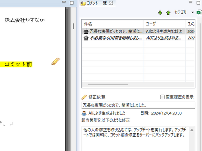 AIによる改善案選択した文章表現に対する改善案を提供し、必要に応じて置き換えることができます。変更点は視覚的にわかりやすくするためにハイライト表示されます。