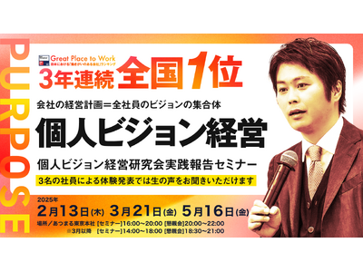 「個人ビジョン経営研究会実践報告セミナー」を開催いたします。代表の石井が登壇するほか、従業員3名が個人ビジョン経営を実践して感じたことを発表いたします。