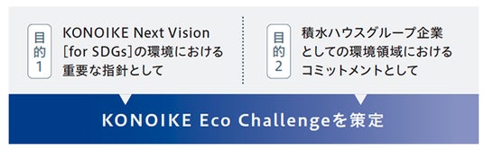 鴻池組では、SDGs(持続可能な開発目標)の枠組みに則り、環境・社会に高い次元で配慮した経営を行う姿勢を明確にすることで企業価値の向上を図ることを目的に、KONOIKE Next Vision [ for SDGs ]を2020年に策定しています。また、積水ハウスグループ企業としての環境領域における目標達成に向けた具体的な方策やリテラシー向上策を取りまとめた「KONOIKE Eco Challenge」も策定しています。