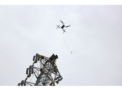 架線業務では、高圧送電線の鉄塔間に電線を渡すために、まず細い延線ロープ(パイロットロープ)を架線し、徐々に太いロープに交換していき、最終的に送電用の電線に差し替えます。今回は、このパイロットロープの架線にドローンを活用しました。