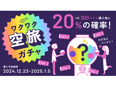 12月23日(月)より、期間限定で 9,980円で1口(300コイン)を購入毎に、おまけのガチャに挑戦することで、20%の確率で行き先ランダムの航空券が当たる特別企画が登場します。