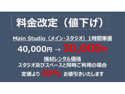 改定価格は、2025年1月1日より新価格体系に移行します。具体的には、Main Studio(メイン・スタジオ)の場合、1時間単価40,000円から30,000円への変更となり、対象となるのは、スタジオ、イベントスペースおよび機材レンタル関係です。機材レンタル価格は、スタジオ及びスペースと同時ご利用の場合、定価より30%お値引きいたします。