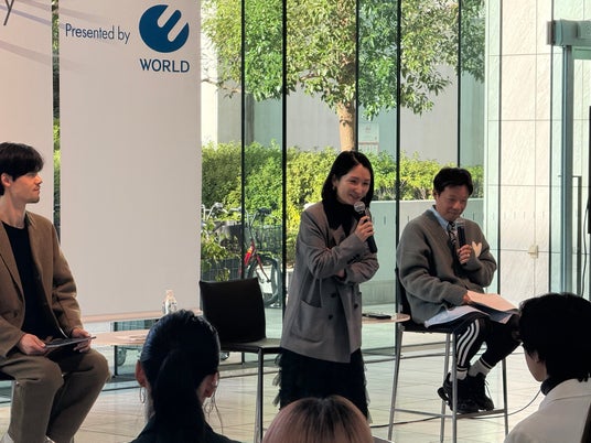 「ナチュラルビューティーベーシック」のブランディングや(株)アルページュが展開するブランドで意識していることなどを「WWDJAPAN」村上要編集長の司会のもと、本橋涼介シニアエディターと共に約80名のワールドグループのデザイナー、MD、バイヤーに向けて伝えました。