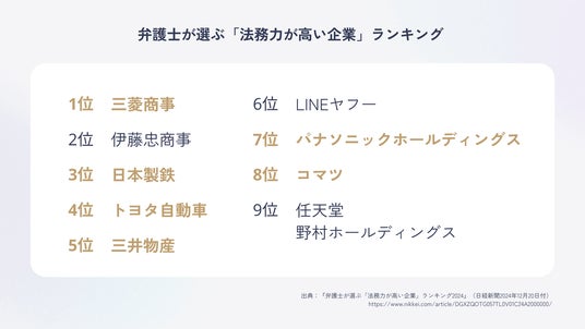「法務力が高い企業」ランキングは、日本経済新聞社が毎年実施している調査で、企業法務に携わる250人の有力な弁護士に聞き、200人から得た回答を集計して作成したものです。それぞれの弁護士が「法務力が高い」と思う企業を3社まで投票した結果として選出されています。