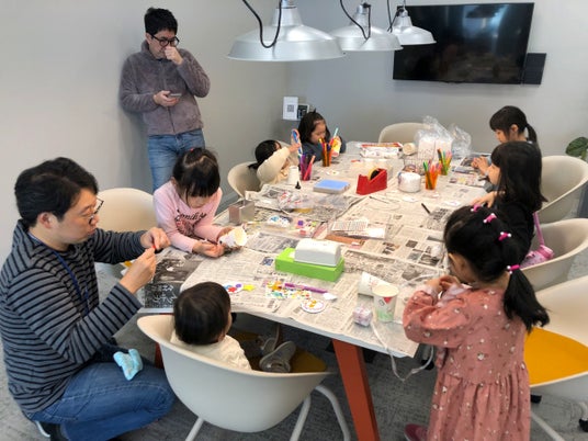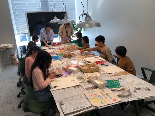 港区在住の子育て世帯を対象に42組の親子をライブオフィスに「palette」に招待し、オカモトヤからは、文房具を使ったけん玉作りやエコバック作り、資生堂ジャパンは母親向けのメイク講座、ハートリボン協会はハートリボン大使による似顔絵教室、スナックゴルフ教室とお弁当の配布とそれぞれのプログラムを実施しました。