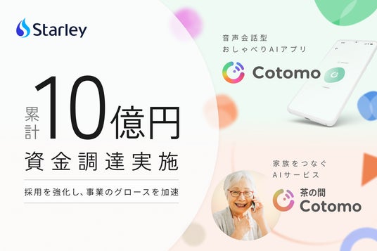 Starleyは、ユーザーとの会話を通じて成長する音声会話型おしゃべりAI「Cotomo(読み:コトモ)」を提供しています。「Cotomo」は、日常会話や雑談を得意とし、ユーザーの興味や好みに基づいた話題について、快適な間やスピードでコミュニケーションすることができます。2024年2月のリリースから現時点までに、累計返答回数が約4億回となり、生成AIを用いたプロダクトとしては、有数の規模に成長しています。また、2024年12月には、シニア向けサービスとして、離れた家族を電話を通じたおしゃべりで見守るAIサービス「茶の間Cotomo(読み:チャノマコトモ)」の提供を開始しました。