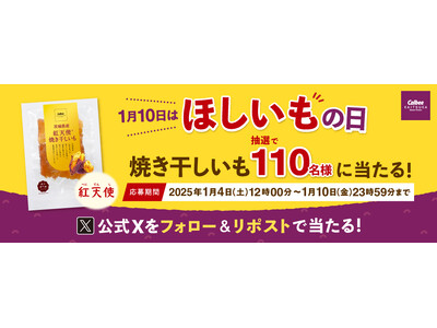 カルビーかいつかスイートポテト株式会社(本社:茨城県かすみがうら市、代表取締役社長:安藤 國行)は、「ほしいもの日」(1月10日)を記念して、濃厚な蜜の甘さと焼き芋の香ばしさが特長の『紅天使 焼き干しいも』が当たるプレゼントキャンペーンを2025年1月4日から1月10日まで実施いたします。