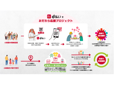 本協定では、ドコモのスマートフォン決済サービス「d払い(R)」を活用したキャッシュレス募金(以下、「d払い」募金)や、「ジモティーすくすくバトン※1」を活用した子ども服などの回収・配布による地域の子どもの育成を応援する施策「おだわら応援プロジェクト」に取り組みます。