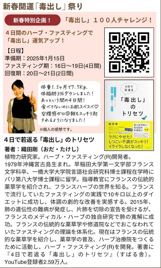 織田先生監修!フランス式ハーブファスティングを実践した先輩が伴奏し、仲間と共に「カラダとココロを整える」プロジェクトがスタート。2025年こそ、身軽になって「若返ろう」