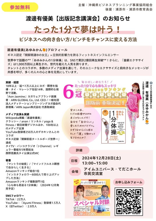 渡邉有優美(あゆみかん )氏は、20年以上のヨガ指導経験と自身のギネス記録保持者としての活動をしながら、簡単で継続しやすい健康法として「1分体操」を考案。