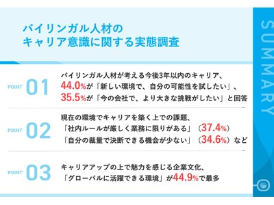 - 01|バイリンガル人材が考える今後3年以内のキャリア、44.0%が「新しい環境で、自分の可能性を試したい」、35.5%が「今の会社で、より大きな挑戦がしたい」と回答