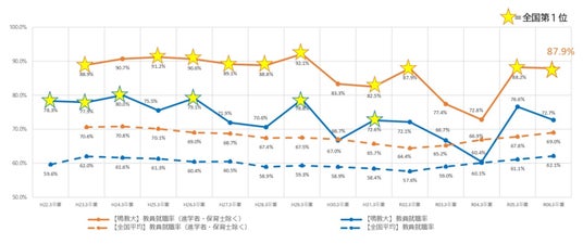 鳴門教育大学学校教育学部は全国トップレベルの教員就職率を維持しており、全国第1位となるのは、前年度に続き2年連続で、母数を卒業生全体で計算した場合の教員就職率も合わせると直近15年間で12回目です。