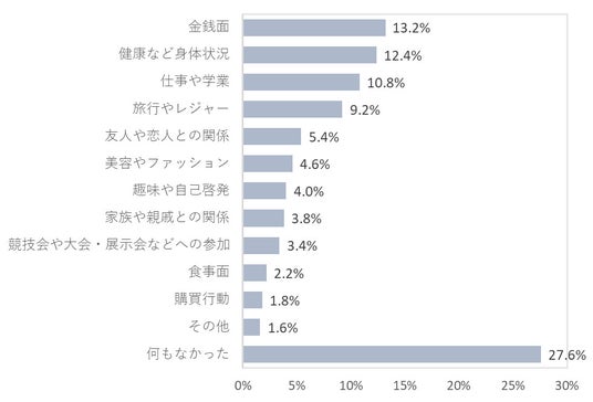 「充実していなかった」ことは「金銭面」および「健康など身体状況」となりました。今年1年間、あなたに起こった出来事でジャンルを問わず印象に残っていることを聞いたところ、「金銭面」については、無駄づかいや思わぬ出費が重なったといった声もみられました。一方、「健康など身体状況」では、病気になったり、健康診断で要検査と診断されたとの意見も挙がっていました。