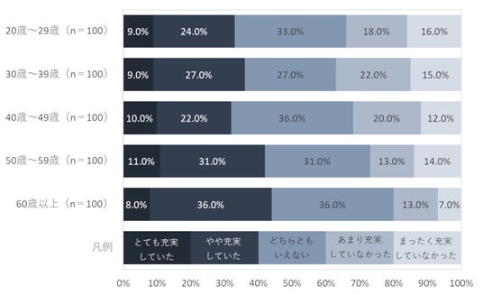 今年の生活の充実度を年代別にみると、「生活が充実していた(とても充実していた+やや充実していた)」との回答が最も多かったのは60歳以上で44.0%となり、シニア世代で生活の充実度が高い傾向があることがわかりました。また、一つ下の世代の50代も42%と、僅差で続いています。一方、「生活が充実していなかった(まったく充実していなかった+あまり充実していなかった)」の回答では、30代がトップで37%、次いで20代が34%と、若年層における生活の充実度の低さが目立つ結果となりました。