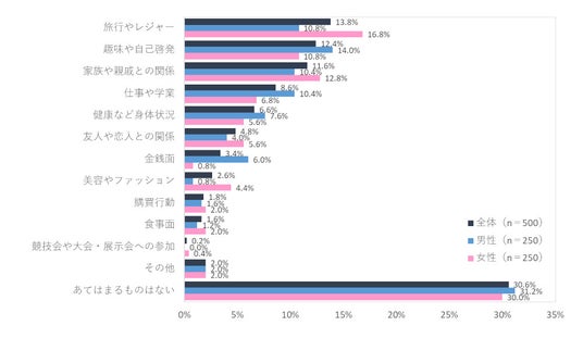 今年最も充実していたことは「あてはまるものはない」が最も多く30.6%、次いで「旅行やレジャー」が13.8%でした。以下、「趣味や自己啓発」が12.4%、「家族や親戚との関係」が11.6%と続いています。今年は、行動制限が一切なく、旅行者数も増加傾向にあることから、「旅行やレジャー」の充実度が高まったと考えられます。男女別にみると、女性は「旅行やレジャー」(16.8%)が2位だったのに対して、男性は「趣味や自己啓発」(14.0%)が2位となり、充実していたことに違いがみられました。