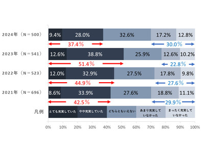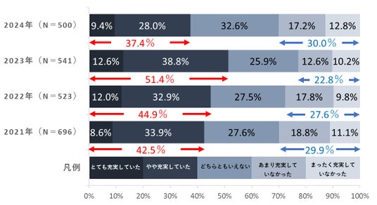 今年は昨年実施した調査(2023年12月18日~25日)に比べて、「生活が充実していた(とても充実していた+やや充実していた)」が14ポイント減の37.4%となり、2021年の調査開始以来、初めて前年を下回りました。一方、「どちらともいえない」は昨年から6.7ポイント増の32.6%、「生活が充実していなかった(あまり充実していなかった+まったく充実していなかった)」は昨年から7.2ポイント増の30.0%となり、今年は、生活の充実度が低下した1年であったことが浮き彫りとなりました。