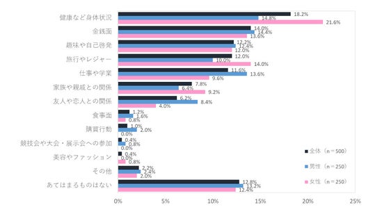 2025年に最も充実させたいことでは、「健康など身体状況」が18.2%、「金銭面」が14.0%、「趣味や自己啓発」が12.2%、「旅行やレジャー」が12.0%となりました。今年最も充実していなかったことで2位だった「健康など身体状況」が、ここではトップとなり、来年こそ充実させたいと思っている人が多いことが明らかになりました。男女別でみても、男性・女性ともに最も多かった回答は「健康など身体状況」でした。特に女性は21.0%と、男性の14.8%を大きく上回り、健康への関心がさらに高まっている可能性が示唆されました。