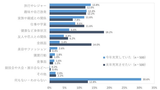 今年最も充実していたことと来年最も充実させたいことを比較した結果、「健康など身体状況」(11.6ポイント増)と「金銭面」(10.6ポイント増)が大きく比率を伸ばしていました。次いで、「仕事や学業」が3.0ポイント増と比率を伸ばしています。反対に大きくポイントを下げたのは「何もない・わからない」が17.8ポイント減、「家族や親戚との関係」が3.8ポイント減となりました。「旅行やレジャー」と「趣味や自己啓発」については、今年と来年との比較で大きなポイント差はなく、引き続き充実させていきたい項目であることがわかりました。