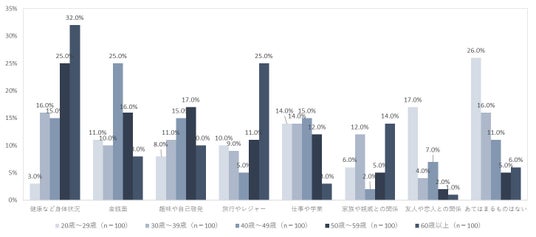 来年については、「健康など身体状況」を充実させたいが最も多くの回答を得ました。しかし、年代別にみてみると、「健康など身体状況」は60代、50代で高く、働き世代の40代では「金銭面」がトップとなっています。20代では「健康など身体状況」との回答は1割にも満たない状況です。逆に「あてはまるものは何もない」に多くの回答が集まるなど排他的な声が多数を占めました。