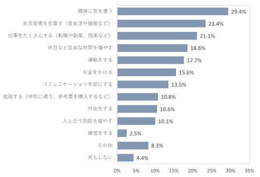 「来年最も充実させたいこと」のために何をするかでは、「健康に気を遣う」が29.4%でトップとなりました。以下、「生活習慣を見直す(食生活や睡眠など)」(23.4%)、「仕事をたくさんする(転職や副業、残業など)」(21.1%) 、「休日など自由な時間を増やす(18.6%)、「運動をする」(17.7%)の順となりました。ヘルスケアや生活習慣の改善、自然災害への備えなど、健康志向のさらなる高まりを印象付ける結果となりました。