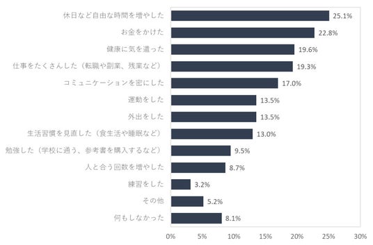「今年1年間で最も充実していたことは何ですか?」で回答したことを充実させるためにしたことは、「休日など自由な時間を増やした」が25.1%、「お金をかけた」が22.8%で上位に挙がりました。次いで、「健康に気を遣った」が19.6%、「仕事をたくさんした(転職や副業、残業など)」が19.3%と続いています。今年は、「旅行やレジャー」「趣味や自己啓発」の充実度が高まっていることから、そのために「休日など自由な時間を増やした」「お金をかけた」という人が多かったと思われます。