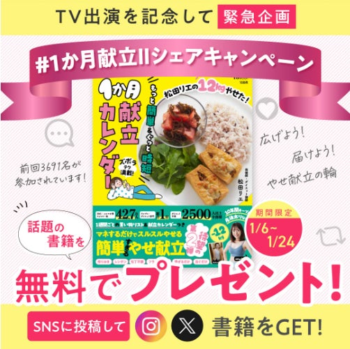 松田リエの12kgやせた!もっと簡単&ぐっと時短1か月献立カレンダー 」(宝島社)についても取り上げていただき、献立カレンダーの実践ポイントも紹介するので、ぜひご覧ください。