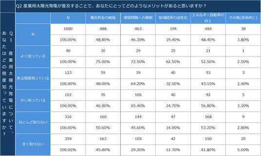 以下のクロス集計表からは、産業用太陽光発電の認知度が高い人ほど、その普及によるメリットをより多く認識している可能性が読み取れます。