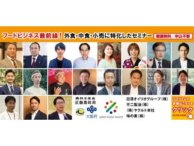 大阪を代表する外食チェーン株式会社大阪王将の文野社長や株式会社GANKOの小嶋社長が登壇!大手メーカー4社によるパネルディスカッションや、女性経営者によるセッションも実施。さらに、“100年先に残したい食”をテーマにした『兵庫のテロワール』では、さまざまな業態の専門家が集結します。ここでしか聞けない貴重な[無料]セミナーをお見逃しなく!