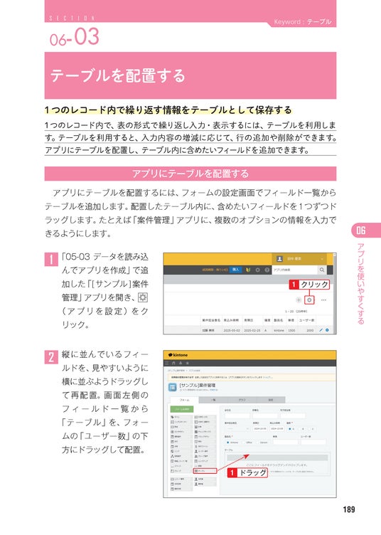 サービスの概要から導入のメリット、画面の見方や各機能の解説、アプリの作成と活用、管理者が行う各種設定まで、画面写真とともに、ステップバイステップで詳しく解説しています。