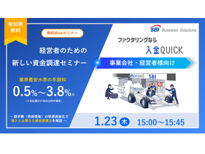 総合フィンテックソリューション企業であるSBI FinTech Solutions株式会社の子会社で、バックオフィス支援サービスを提供するSBIビジネス・ソリューションズ株式会社(本社:東京都港区、代表取締役社長:夏川 雅貴、以下「当社」)は、事業会社・経営者様向けに「業界最安水準の手数料0.5%~3.8%*1!新しいファクタリング 入金QUICKセミナー」を1月23日(木)15時から開催しますので、お知らせいたします。