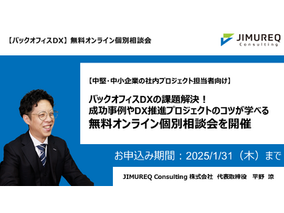 JIMUREQ Consulting株式会社(本社:東京都中央区、代表取締役:平野 涼)は、中堅・中小企業の社内プロジェクト担当者を対象とした、バックオフィスDXの成功事例や、課題解決に向けたプロジェクト推進のコツが学べる無料のオンライン個別相談会を開催いたします。