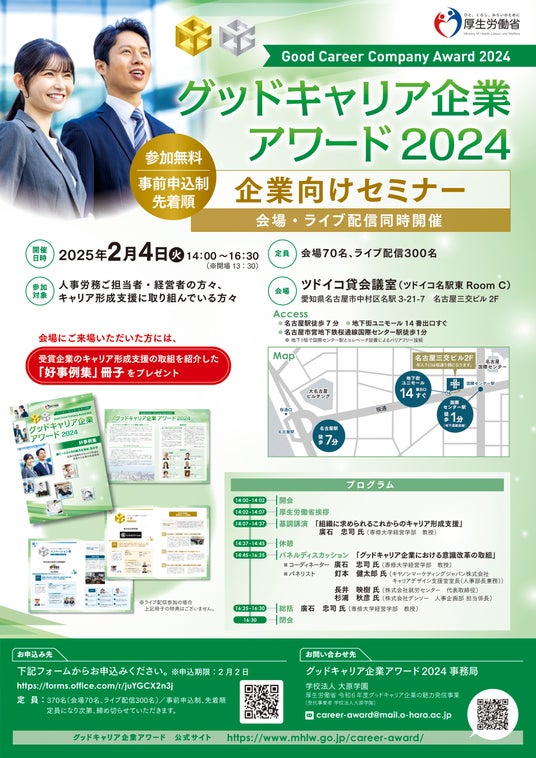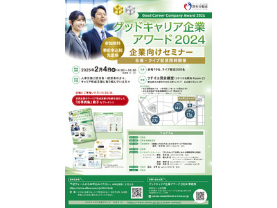 厚生労働省は2月4日(火)に愛知県名古屋市で、「グッドキャリア企業アワード2024 企業向けセミナー」を開催します。このセミナーでは、従業員の自律的なキャリア形成支援の取組などを広く周知し、キャリア形成支援の重要性を普及・定着させることを目的に実施します。今回のセミナーでは、「グッドキャリア企業アワード2024」審査委員による基調講演や、受賞企業の人事担当者を迎え、キャリア形成支援の取組や効果に関するパネルディスカッションを実施します。