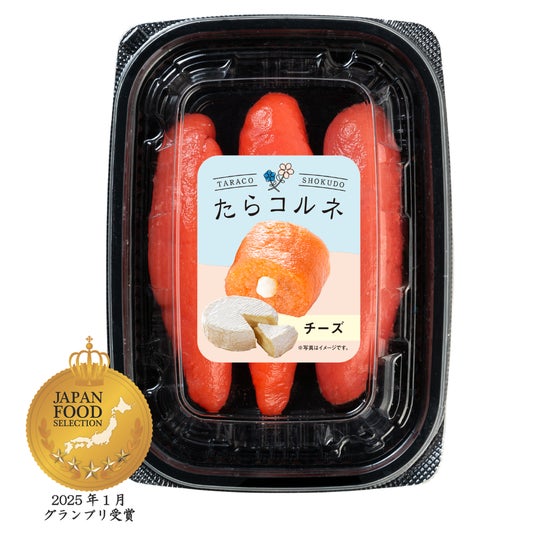 「たらコルネ」チーズは、生のたらこの中にクリームチーズ・カマンベールチーズ・ゴーダチーズ・チェダーチーズと4種類のチーズをブレンドしたチーズペーストを注入している。マイルドなブレンドチーズは癖がなく口の温度で程よく溶け出すと同時にたらこの旨味が広がる逸品。たらこに臭みがないからこその相乗効果。