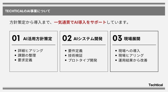 株式会社Techtical(本社:東京都渋谷区、代表取締役社長:井上 翔宇)は、社内業務効率化に向けた「生成AI導入ソリューションサービス」を展開しております。
