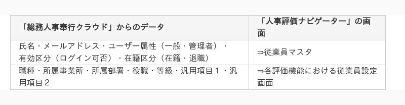 「総務人事奉行クラウド」と「人事評価ナビゲーター」がAPI連携することにより、以下のデータが各システムの画面に自動収集されます。