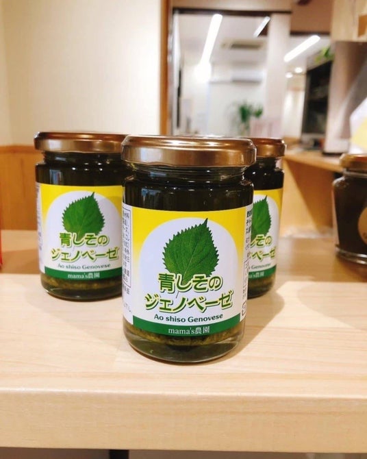 青しそジェノベーゼ香りの良い青しそペーストに、オリーブ油グラナパダーチーズ、松の実を加えてペースト状にしました
