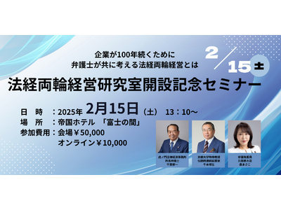そこで、この法経両輪経営について、さらに研究・研鑽を重ねるため、この度「法経両輪経営研究室」しました。今回、この研究室開設を記念して、法経両輪経営の在り方や企業の目指すべき方向性などについて、セミナーを開催いたします。