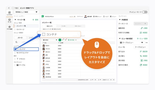 既存のデータと権限を活用しながら本サービスのアプリビルダーを使用することで、用意されたテンプレートを簡単・自由にカスタマイズした業務アプリを作成することができます。