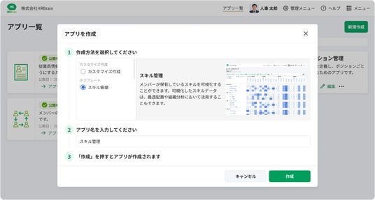 そこでHRBrainは、「シンプルに始められ、変化に強いシステム」として本サービスを提供開始しました。このシステムはノーコードでアプリのカスタマイズや新規構築が可能で、柔軟な運用と迅速な対応を実現します。また、堅牢なデータ管理と使いやすい人材データ活用機能を両立し、人事業務や現場業務のDXを幅広く支援します。