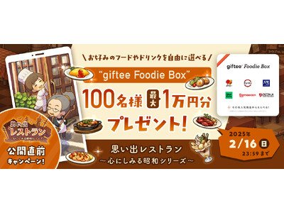 このたび弊社では、お腹も心もあったまる完全新作スマホゲーム「思い出レストラン ~心にしみる昭和シリーズ~」のAppStore、Google Playでの事前登録を開始いたしました。これを記念して公式X(旧Twitter)では、合計100名様に最大1万円分の「giftee Foodie Box」が当たるプレゼントキャンペーンを実施いたします。「giftee Foodie Box」はお好きなフードやドリンクの商品を自由に選べるギフトです。