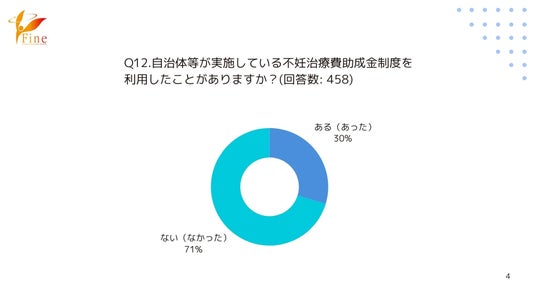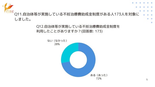 - 自治体等が実施している不妊治療費助成金制度を利用したことがある人は30%、ない人は71%でした(Q12)。しかし、助成金制度が「ある」と答えた人に絞ってみると、72%が助成金を利用していました。<グラフ2><グラフ3>