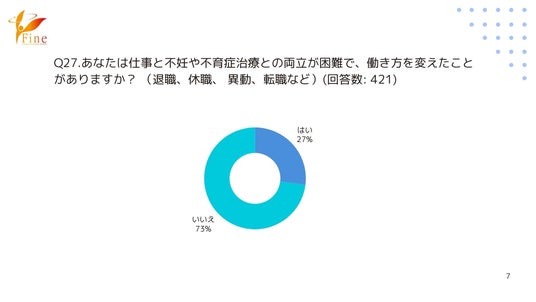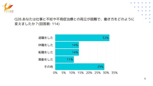 - 仕事と不妊や不育症治療の両立が困難で働き方を変えた人は27%でした(Q27)。働き方をどのように変えたかは、「退職」(32%)、「休職」(14%)、「転職」(14%)でした(Q28)。<グラフ5>