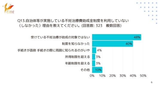 - 助成金を利用していない(しなかった)理由のトップは「受けている不妊治療が助成の対象ではない」(48%)、次いで「制度を知らなかった」(40%)でした(Q13)。<グラフ4>