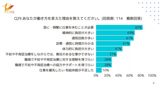 - 働き方を変えた理由は、「急に・頻繁に仕事を休むことが必要」(83%)、「精神的に負担が大きい」(69%) 、「通院回数が多い」(67%)、「 診察・通院に時間がかかる」(61%)で、時間的負担と精神的負担が上位でした(Q29)。<グラフ7>