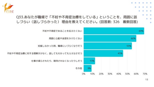 - 職場で「話している」と答えた人に絞ってみると、70%が話しづらく感じており、職場で話したが、話しづらかった人が多いことがわかりました。その理由で多かったのは、「不妊や不育症であることを伝えたくない」(69%)、「周囲に心配や迷惑をかけたくない」(60%)、「妊娠しなかった時、職場にいづらくなりそう」(55%)でした(Q33)。<グラフ10><グラフ11>