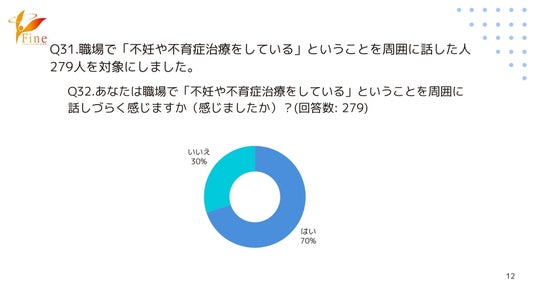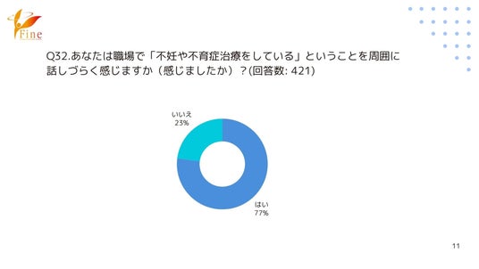 - 職場で「不妊や不育症治療をしている」ということを周囲に話しづらく感じた人は77%、話しづらく感じなかった人は23%でした(Q32)。<グラフ9>