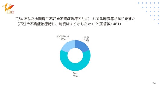 - 職場に不妊や不育症治療をサポートする制度等がある人は19%、ない人は62%、わからない人は19%でした(Q34)。<グラフ12>