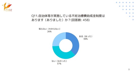 - 自治体等が実施している不妊治療費助成金制度の有無については、「ある」(38%)、「ない」(37%)、「知らない(わからない)」(26%)でした(Q11)。<グラフ1>